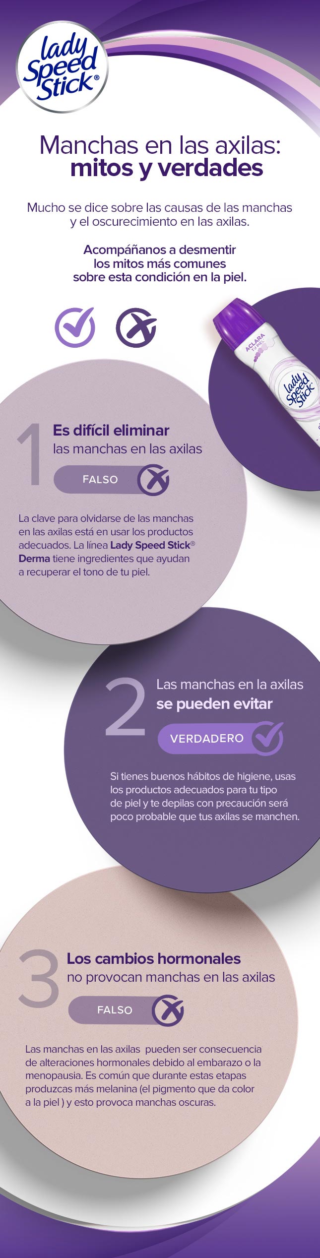 FALSO: La clave para olvidarse de las manchas en las axilas es usar los productos adecuados, como la línea Lady Speed Stick® Derma Extra Aclarado, la cual tiene ingredientes que mejoran el tono de tu piel. Además, este antitranspirante te protege hasta por 48 horas, así que no tendrás que preocuparte por las manchas ni por el sudor.