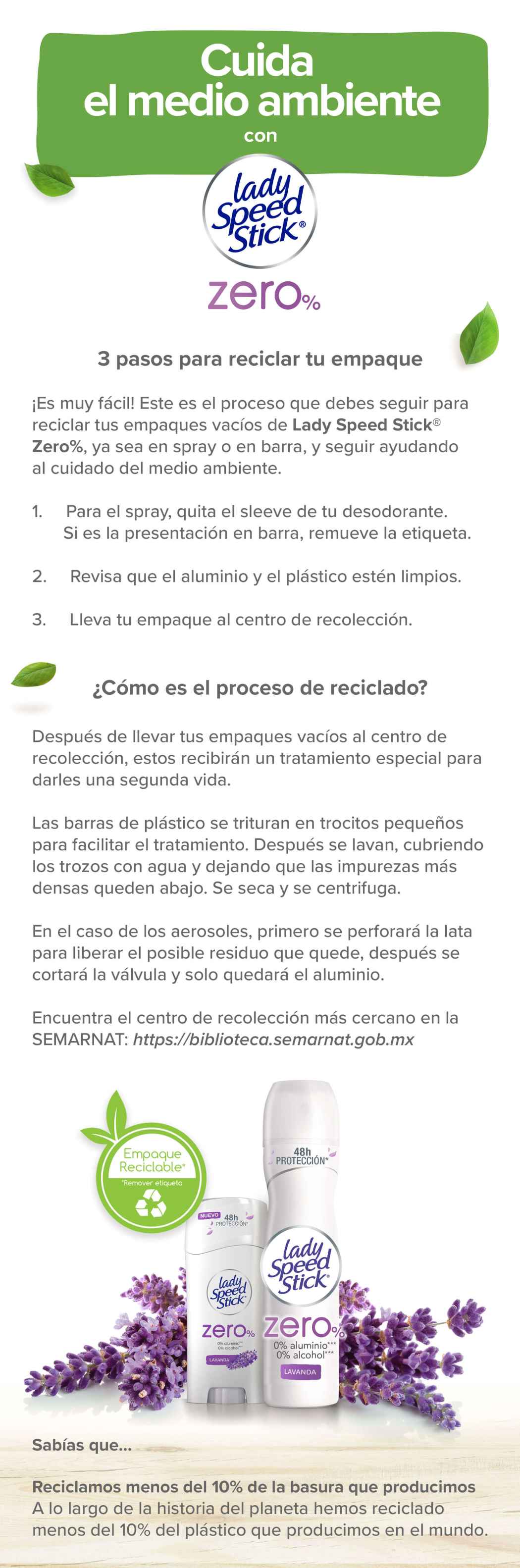 ¡No tires tu desodorante a la basura! Una vez que se termine tu Lady Speed Stick®Zero%, ya sea en barra o spray, puedes poner tu granito de arena y sumarte al proceso de reciclaje. Es muy fácil y lo haces de volada. Estos son los pasos que debes seguir: