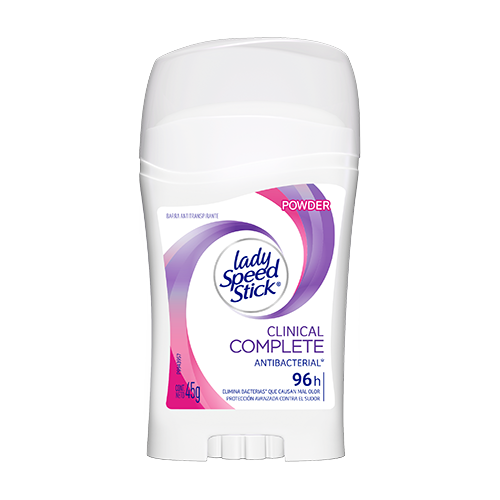 Lady Speed Stick Clinical Complete Powder, desodorante antibacterial en barra que brinda protección de larga duración contra el sudor y el mal olor.