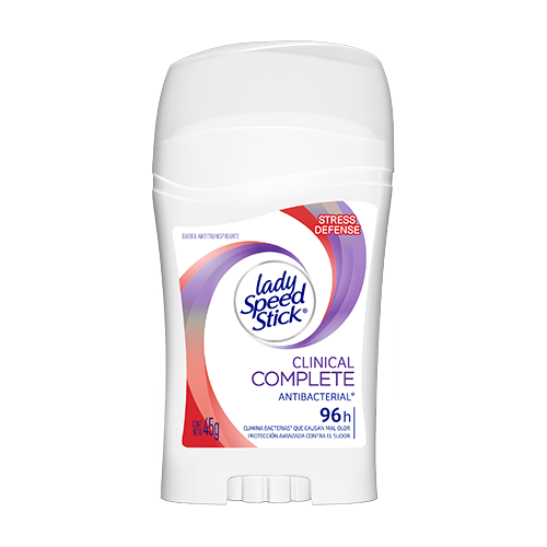 Desodorante en barra Lady Speed Stick Clinical Complete Stress Defense. Protección efectiva contra el sudor provocado por estrés. Segura en todo momento.